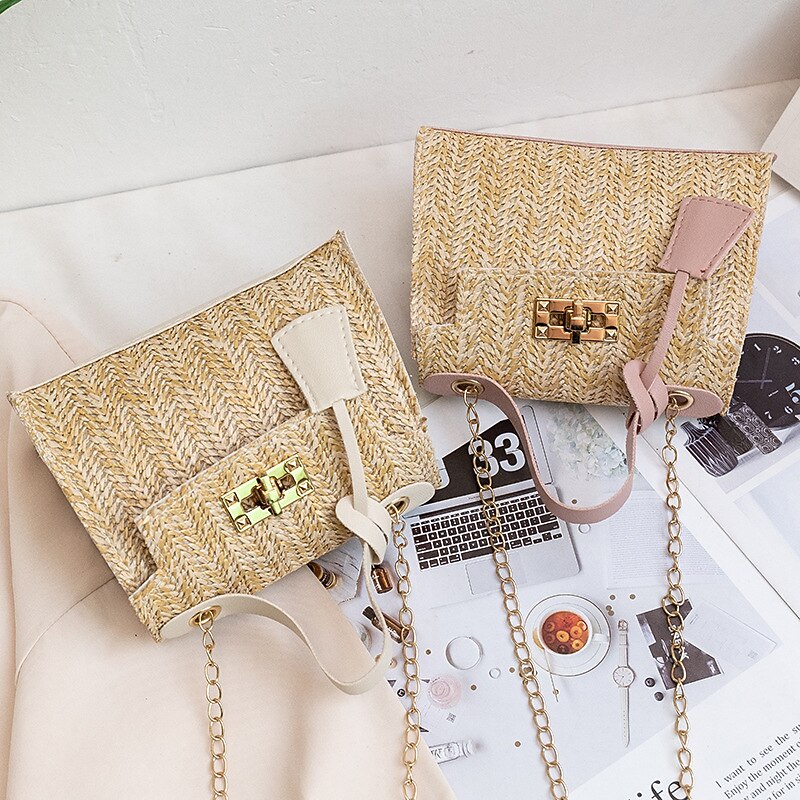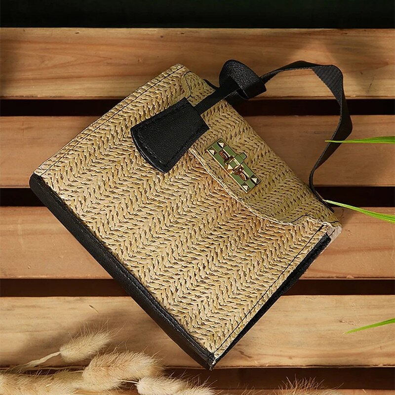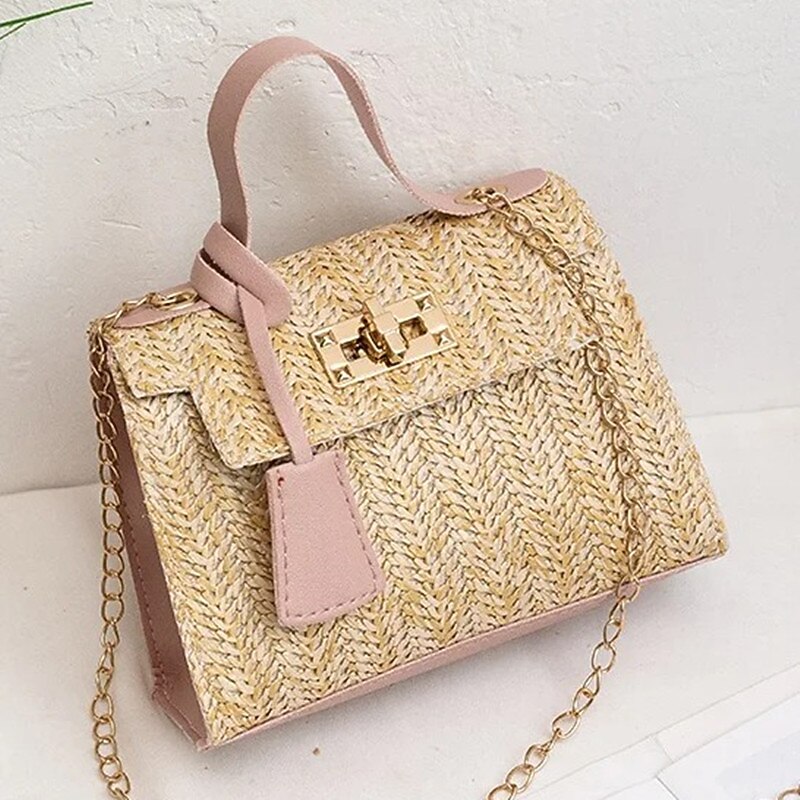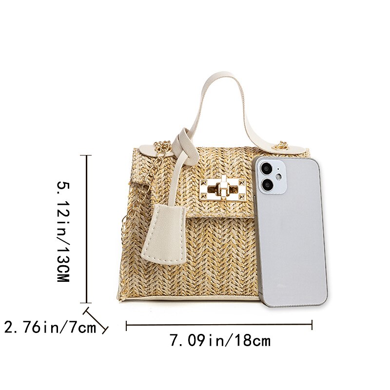 HOT ! Women's Straw Top Handle Bag – Woven Summer Handbag with Gold Chain Strap & Turn-Lock Closure for Beach, Vacation & Casual Outings