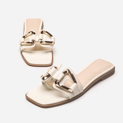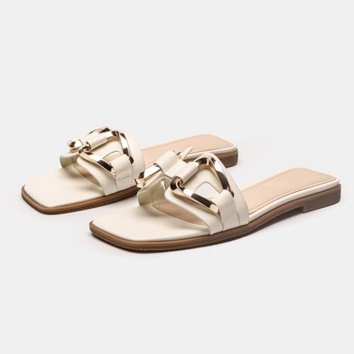 HOT ! Lossarye Women's Metal Chain Open Square Toe Slide Sandals Summer Casual Comfortable Slip On Flat Sandals Beach Slippers