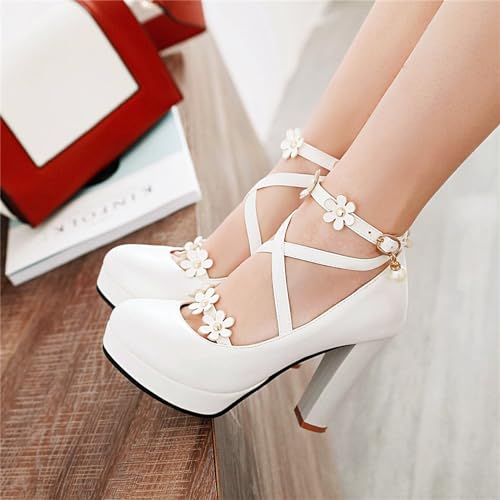 HOT ! Women's Mary Jane Chunky Platform Strappy Pumps Closed Round Toe Block High Heels Ankle Buckle Cross Strap Flower Pearl Dress Ladies Shoes for Wedding Party