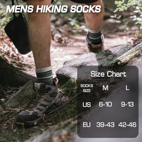 • MENS QUARTER SOCKS: Moisture-wicking fabric, wicks moisture away from the skin and dries quickly. The thickness of the hiking socks men also helps with moisture management, making them ideal for long wear in all weathers