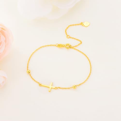 HOT ! Real 14K Gold Cross Bracelet for Women Solid Gold Crucifix Bracelet for Her Religious Jewelry Christmas Gifts, 6.5+1.5 Inches