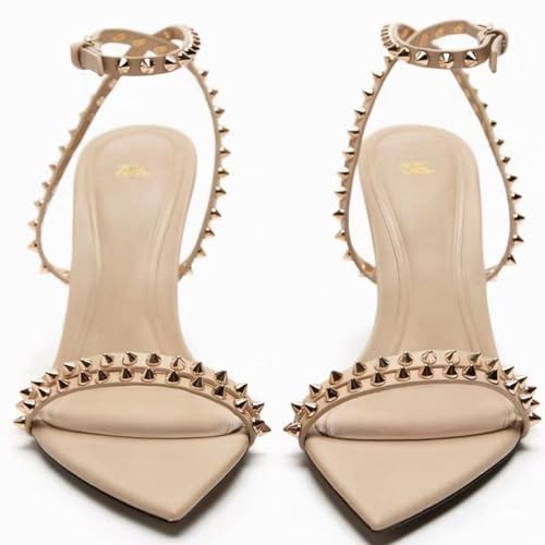 Women's Studded Strappy Open Pointed Toe Stiletto Sandals,Summer Fashion Rivets Ankle Strap Sexy High Heels Party Dress Shoes 4