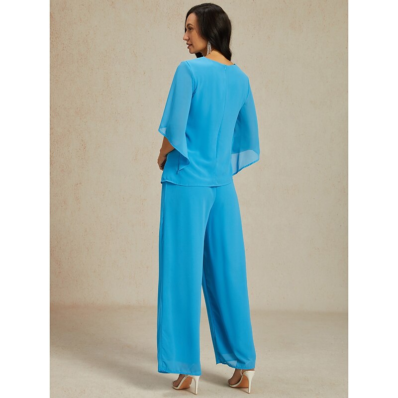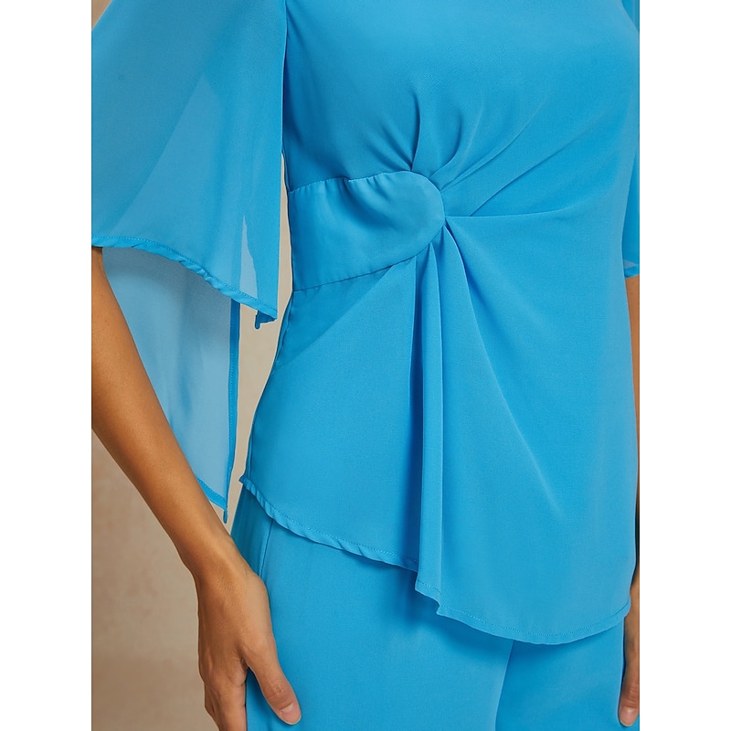 Women's Elegant Stylish Blouse Pants Trousers Half Sleeve Crew Neck Plain Ruched Wedding Guest Daily Blue Summer Regular Fit 3