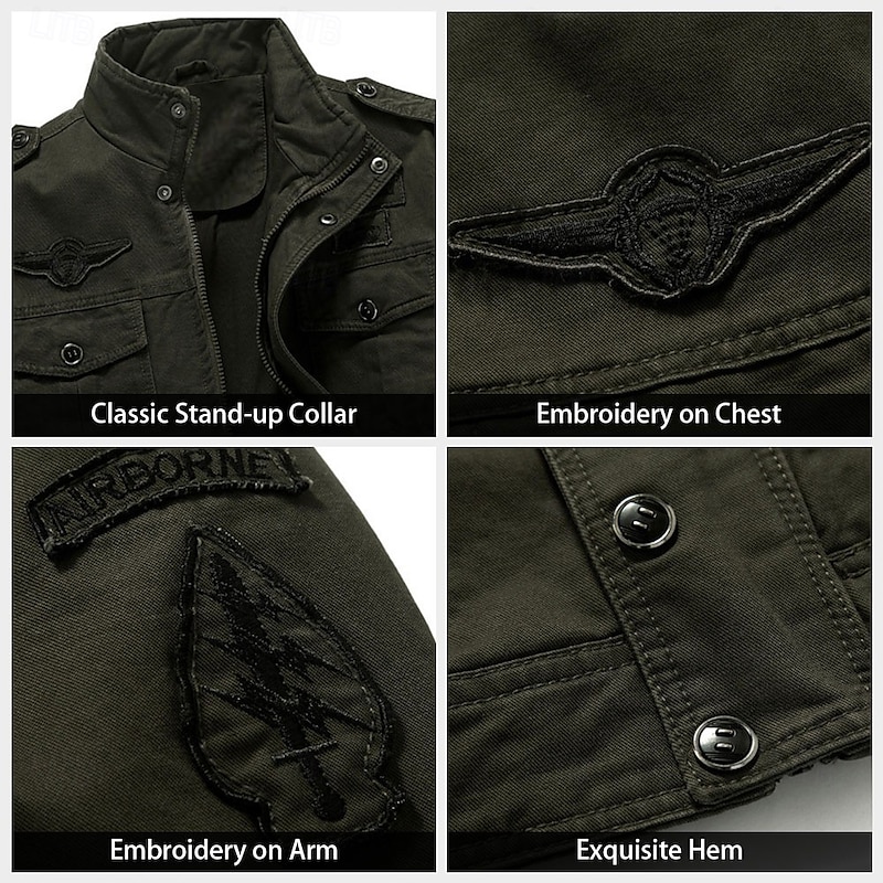 Men's Cotton Embroidered Military Jacket with Shoulder Straps Long Sleeve Standing Collar Multi-Pockets Trucker Jacket US Flag Print Tactical Outerwear 5
