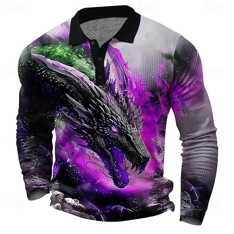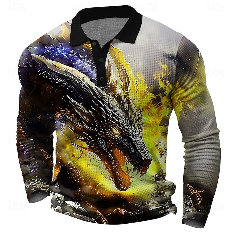 More information about Men's Dragon Waffle Polo Shirts Golf Shirt Long Sleeve Polo Shirts Collared Shirts Casual Funny Streetwear Vacation Wear Party Outfits Buttons 3D Print Spring Fall Winter Golden yellow Red Blue
