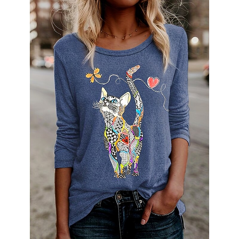 HOT ! Women's T shirt Long Sleeve Floral Graphic Cat Vintage Stylish Classic Long Sleeve Crew Neck Regular Tops Daily Print Black Blue Green Spring Fall Prefall