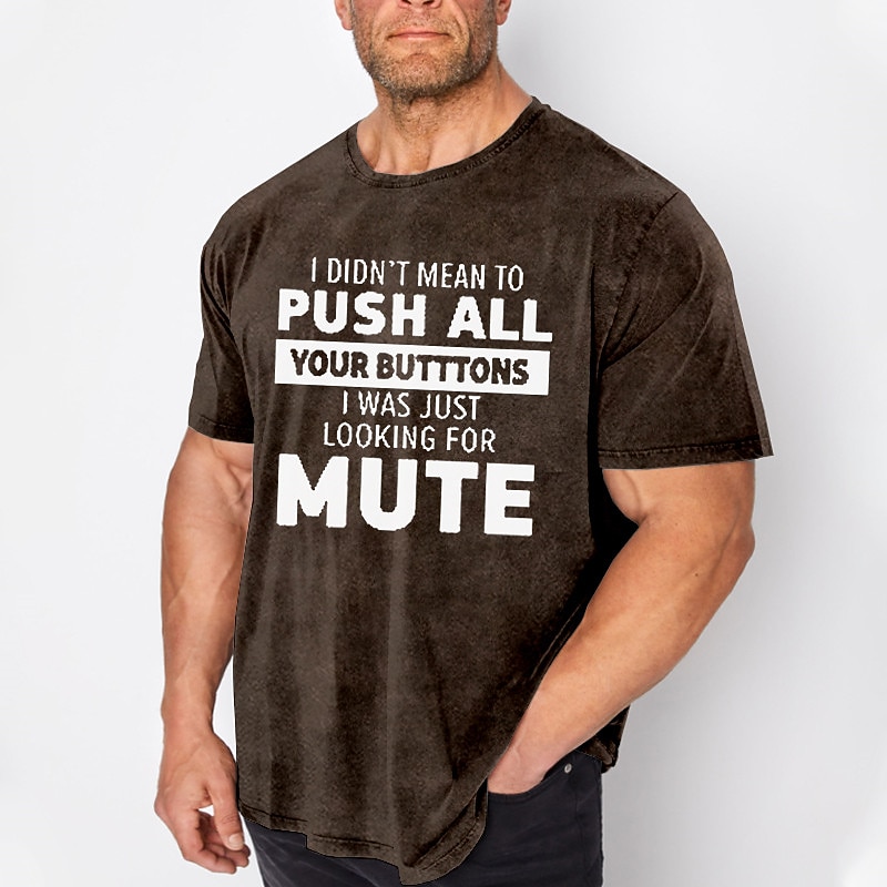 : The t-shirt showcases a humorous and eye-catching graphic print with the playful quote: "I didn't mean to push all your buttons, I was just looking for mute." The washed, slightly distressed look adds a trendy, vintage vibe, perfect for the fashion-forward individual.