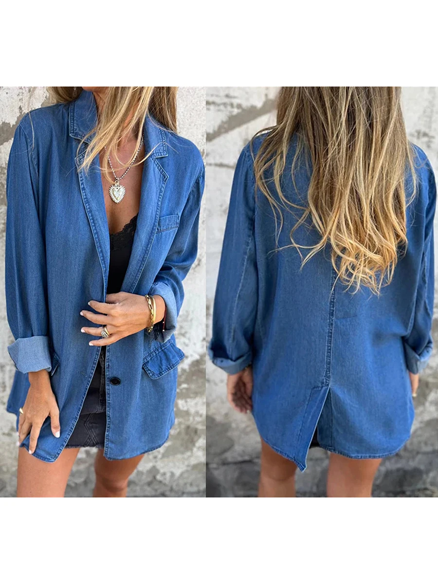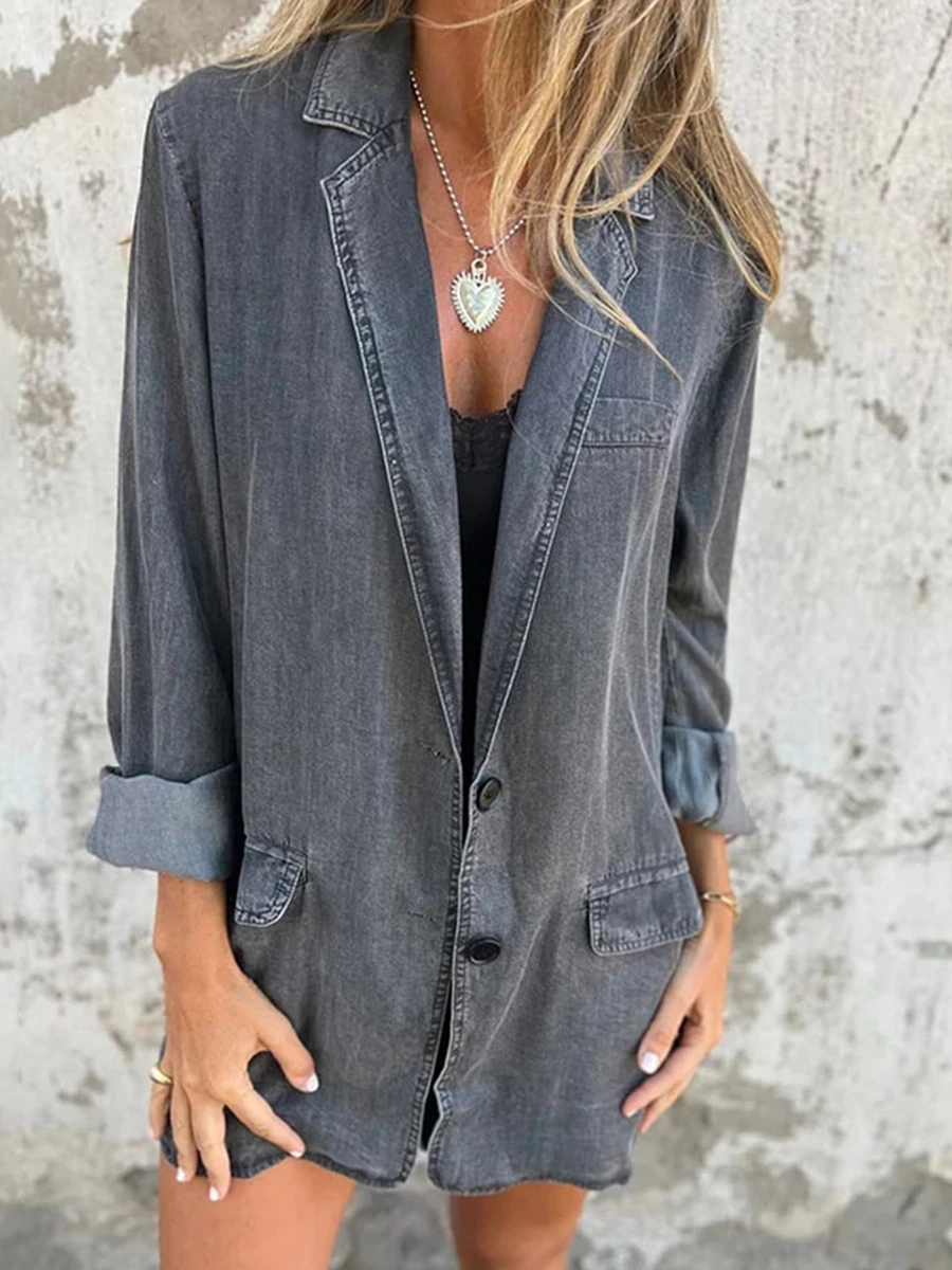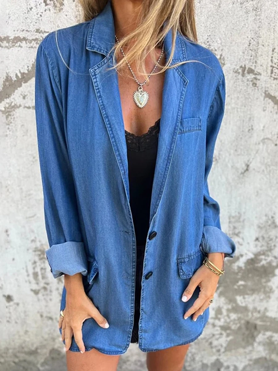SpecificationsChoice: YesClosure Type: Single BreastedCollar: Turn-Down CollarHooded: NoMaterial: Polyester/ DenimPattern Type: SolidSeason: All SeasonThickness: Standard**Please Refer to The Size Chart Below Before Ordering.Size (cm)S Length: 72 Bust: 104 Sleeve: 64M Length: 73 Bust: 108 Sleeve: 65L Length: 74 Bust: 114 Sleeve: 66XL Length: 75 Bust: 120 Sleeve: 67Size (inch)S Length: 28.35 Bust: 40.94 Sleeve: 25.2M Length: 28.74 Bust: 42.52 Sleeve: 25.59L Length: 29.13 Bust: 44.88 Sleeve: 25.98XL Length: 29.53 Bust: 47.24 Sleeve: 26.38