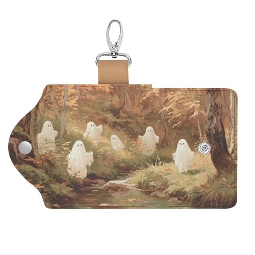 Several Cute White Ghosts in An Autumn Forest Key Holder Bag PU Leather ID Card Holder Keychains Case Cover for Men Women 7