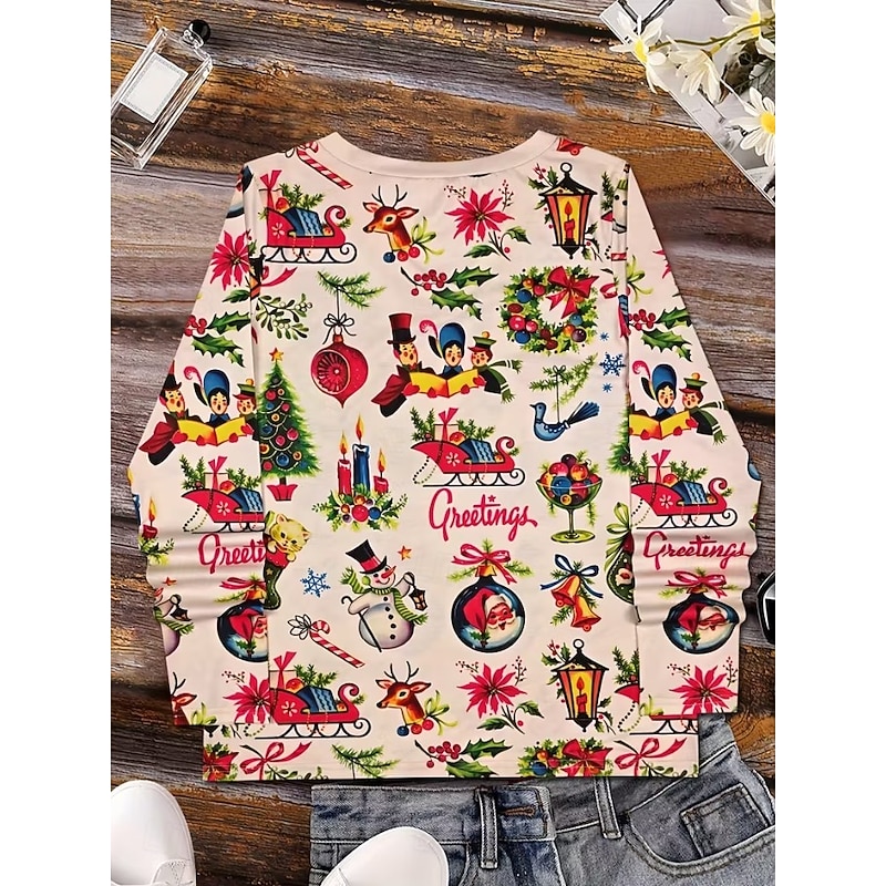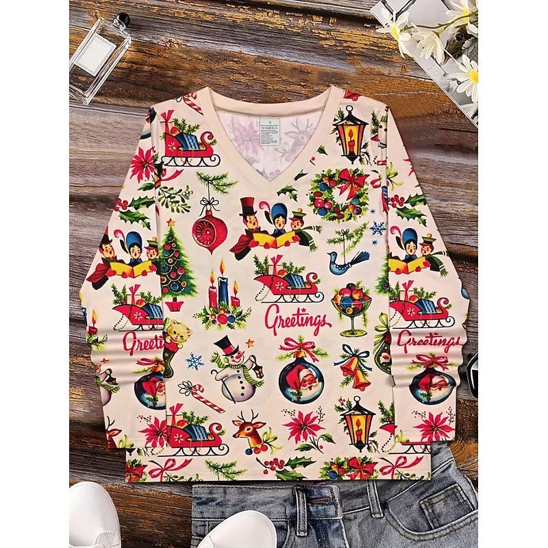 Christmas Women's T Shirt Graphic Christmas Vintage Stylish Classic Long Sleeve V Neck Regular Tops Daily Print Black Wine Red Blue Green Spring Fall Winter 23