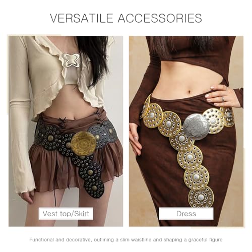 • VINTAGE STYLE: This wide disc belt presents a rugged and cool western cowgirl style, making a classic and retro fashion statement. Disk shaped leather inlaid with metal punched holes, creating a snug fit and flexible adjustable wide waistband. The metal buckle badge with stereoscopic engraving, exquisite and artistic. Metal buckle color adopts a distressed finish, and the antique silver and bronze color exudes a strong sense of vintage nostalgia.
