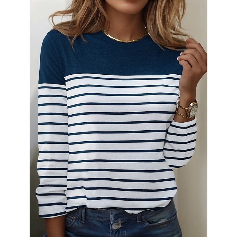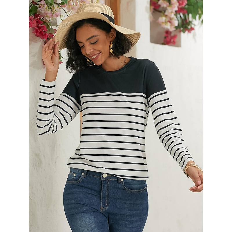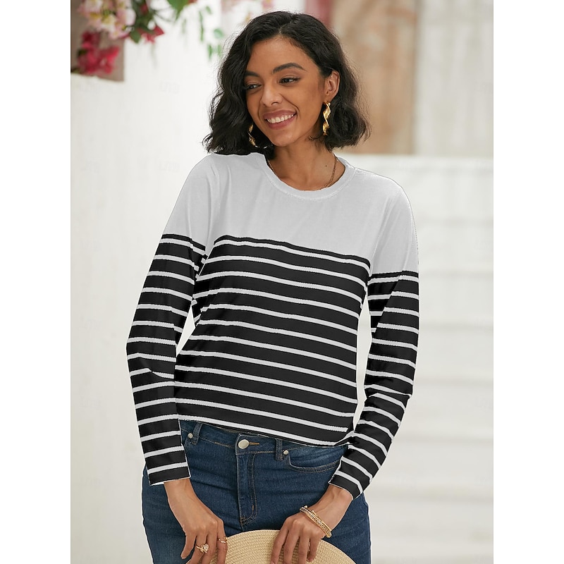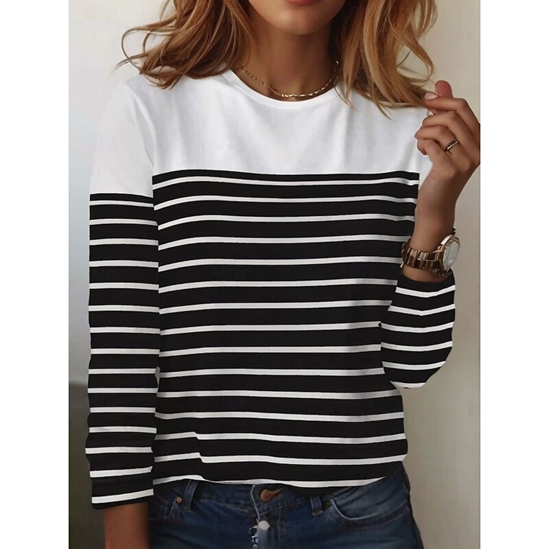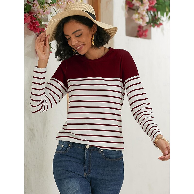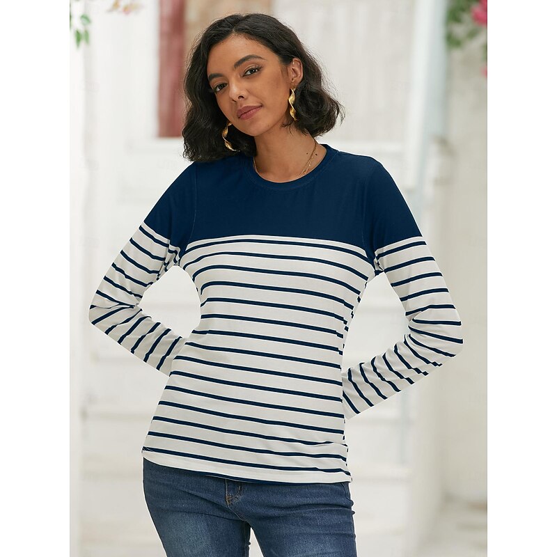 HOT ! Women's T shirt Long Sleeve Crew Neck Long Sleeve Tunic Striped Basic Round Neck Regular Tops Daily Weekend Print Black White Red Blue Gray Fall & Winter Prefall