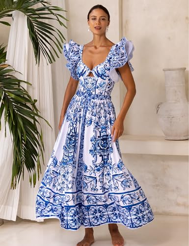 HOT ! FLAXMAKER Ruffle Blue and White Porcelain Pattern Majolica Print One Piece Swimsuit and Skirt/Sarong