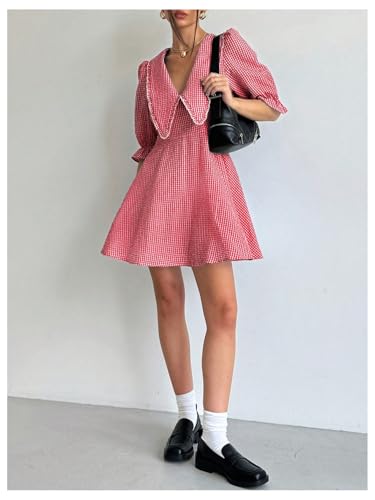 Floerns Women's Gingham Print V Neck A Line Dress Puff Sleeve Flare Hem Short Dresses