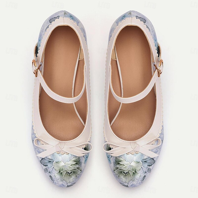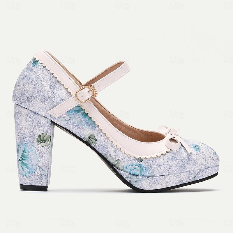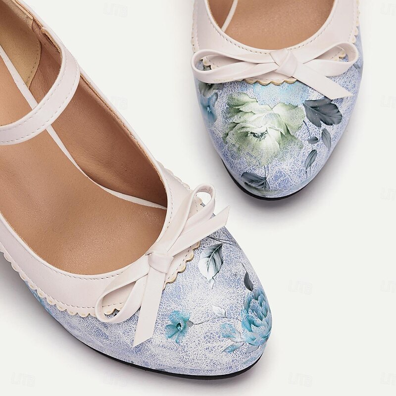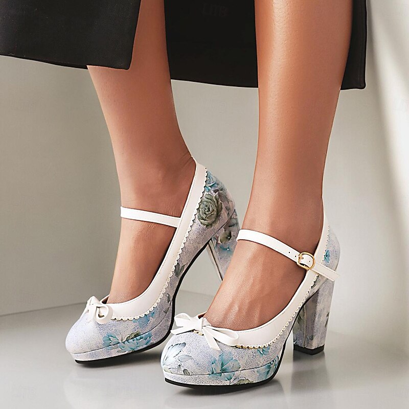 Highlights [Elegant Floral Chunky Heel Mary Janes:] [Fabric and Material:] Crafted with premium PU for the upper and synthetic leather for the lining, these Mary Jane heels offer both durability and a classic brocade-like texture. The sturdy rubber outsole ensures long-lasting wear and stability. [Shape and Fit:] Featuring a round toe and a stable cone heel with a platform, these shoes promise comfort without compromising on style. The standard sizing allows you to select your usual size with confidence. [Design Highlights:] These heels boast a charming floral and color block pattern, accentuated by a delicate scalloped trim and a playful bowknot embellishment on the toe. The adjustable ankle strap with a gold buckle adds both security and a touch of retro elegance. [Occasions:] Perfect for a variety of settings, from parties and daily outings to a professional work environment. Whether you're dressing up for an event or adding vintage flair to your everyday look, these heels are a versatile addition to any wardrobe. [Size Range:] Available in a range of sizes from US6 to US9.5-10, these heels cater to a wide range of foot sizes, ensuring a comfortable fit for everyone.
