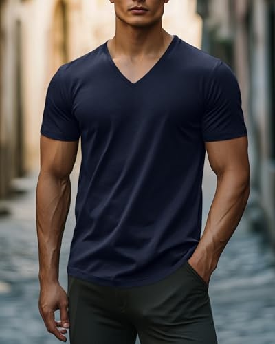 • Men's Stretch Cotton V Neck Shirts: 95% cotton and 5% spandex blend for soft breathability and flexible movement; Lightweight fabric wicks sweat and stays cool during workouts or summer outings