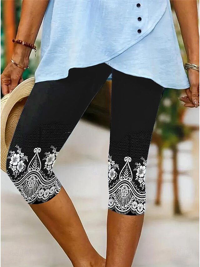 Women's Leggings Capri Pants High Elasticity Vacation Vintage Fashion Calf-Length Mid Waist Floral Graphic Printing Breathable Soft Stretchy Formal Vacation Street Robin's Egg Blue Black Dark Navy 17