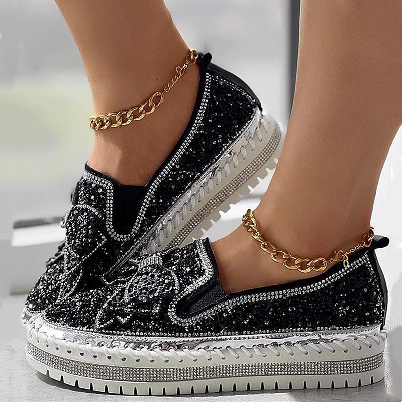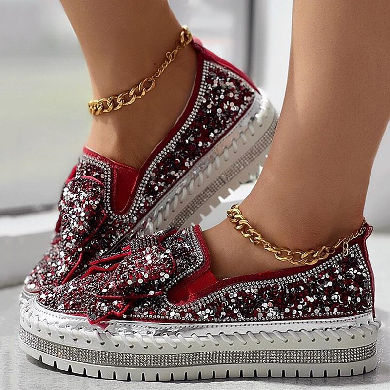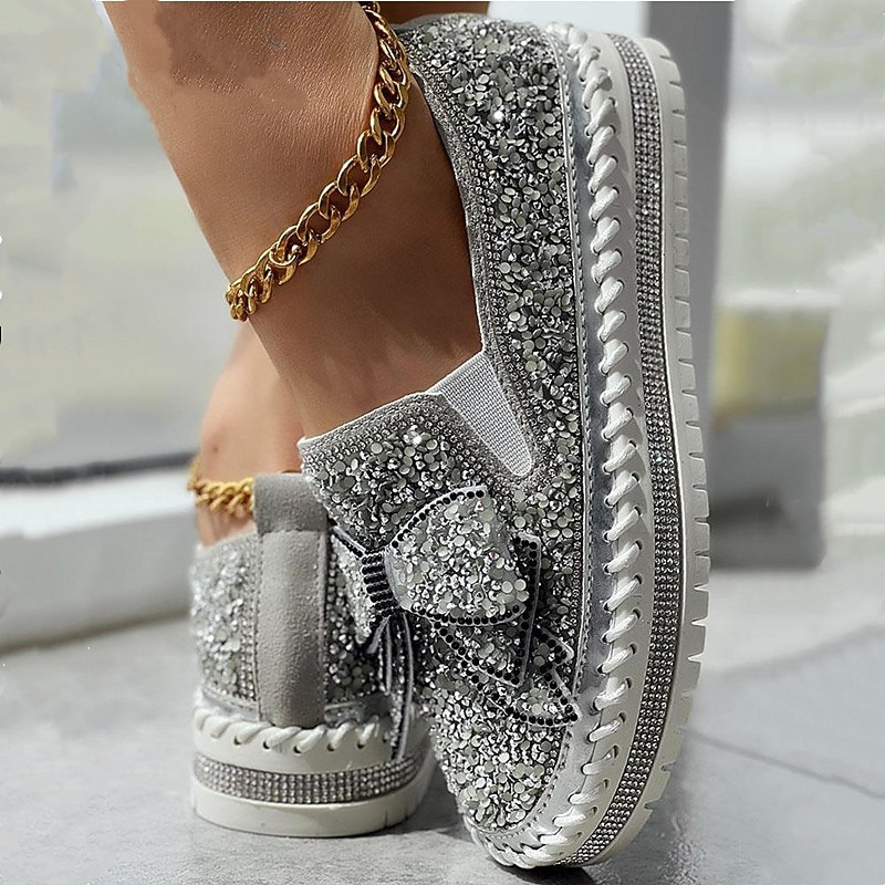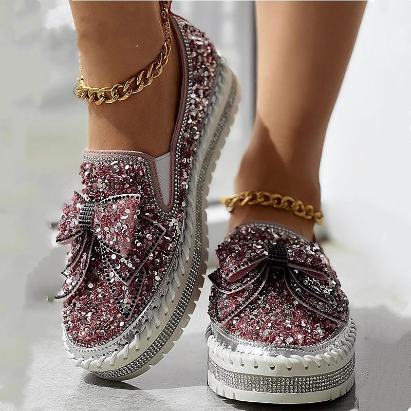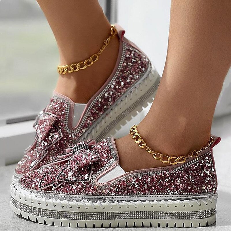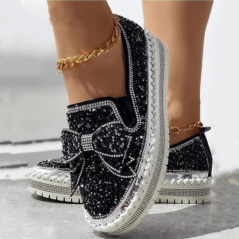 HOT ! Women's Sparkly Rhinestone Slip-On Sneakers – Glitter Bow Platform Loafers for Party, Casual & Streetwear Fashion