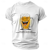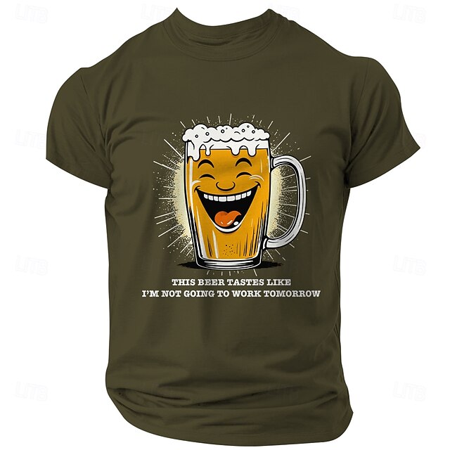 : The focal point of this T-shirt is its humorous print, showcasing a smiling beer mug and a witty slogan, "This beer tastes like I'm not going to work tomorrow." This playful design element makes it an ideal choice for those with a lighthearted sense of style.