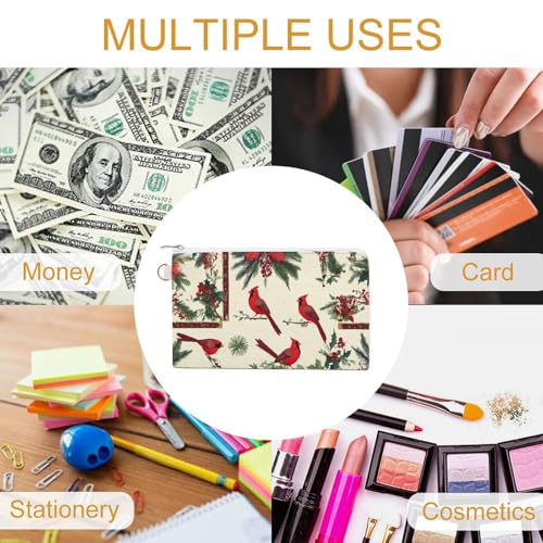 Cardinal Birds Christmas Holly Fashion Coin Purse Change Makeup Bag Canvas Pencil Pouch Travel 5