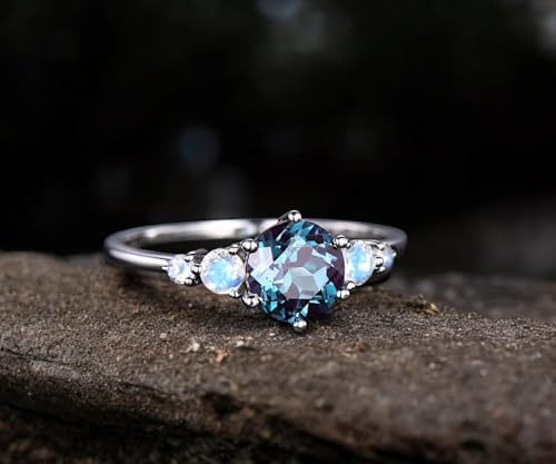 Round Alexandrite Engagement Ring – Rose Gold Solitaire Ring with Moonstone Accents – June Birthstone Promise Ring for Women – Dainty Gemstone Bridal Jewelry 1