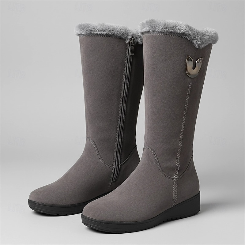 Highlights [Fabric and Comfort]: Crafted with high-quality faux suede, these women's boots offer a luxurious and sleek appearance. The interior is lined with plush faux fur, providing exceptional warmth and cozy comfort for cold winter days. [Style and Fit]: Featuring a versatile mid-calf height, these boots effortlessly complement a range of outfits, from casual to classic. The flat and wedge heel options ensure both comfort and a stylish silhouette, making them ideal for everyday wear. [Design Highlights]: The boots are adorned with a side zipper for easy on-and-off access, complemented by a decorative buckle that adds a touch of elegance and sophistication. The round toe design and sturdy rubber sole provide practicality and excellent traction for winter conditions. [Occasions]: Perfect for various occasions such as winter walks, casual outings, and weekend gatherings, these boots blend style and functionality seamlessly. Their timeless design makes them suitable for both seasonal adventures and everyday activities. [Size Range]: Available in a variety of sizes ranging from US5.5 to US9, these boots cater to diverse foot sizes, ensuring a perfect fit for women seeking both style and comfort in cold weather conditions.