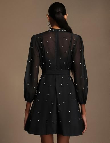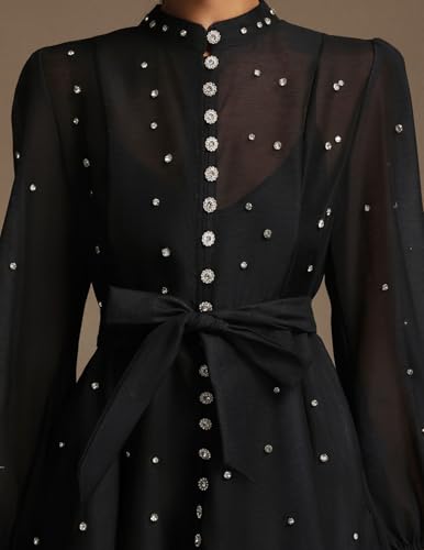 Elegant Black Rainstone Round Neck Long Sleeve Tie Waist Casual Dress 1