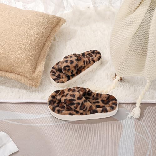 Fuzzy Open Toe House Slippers for Women, Plush Leopard Cross Band Slides, Soft Plush Faux Fur Lining Bedroom Shoes, Non-Slip Winter Indoor Slippers 6