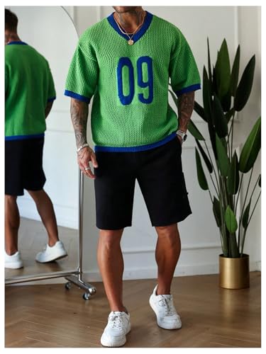 HOT ! COZYEASE Men's Crochet Knit Short Sleeve Sweater Number Graphic V Neck Pullover Sweaters