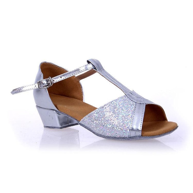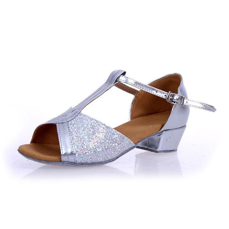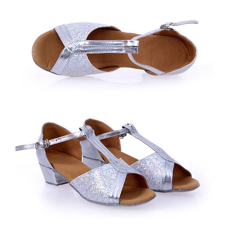 More information about Girls' Latin Dance Shoes Dance Shoes Performance Stage Indoor Sparkling Shoes Heel Glitter Low Heel Thick Heel T-Strap Silver Gold