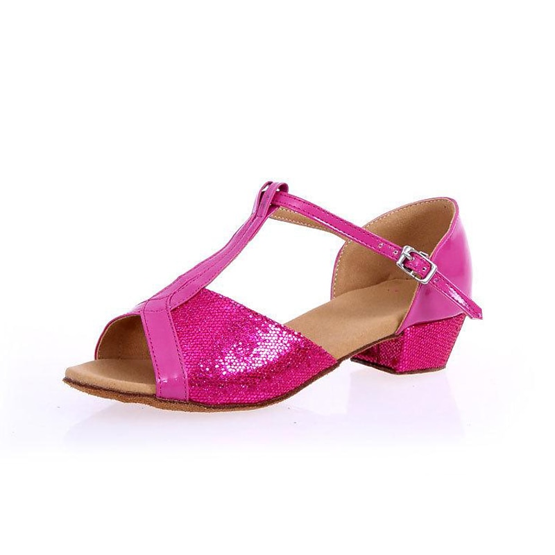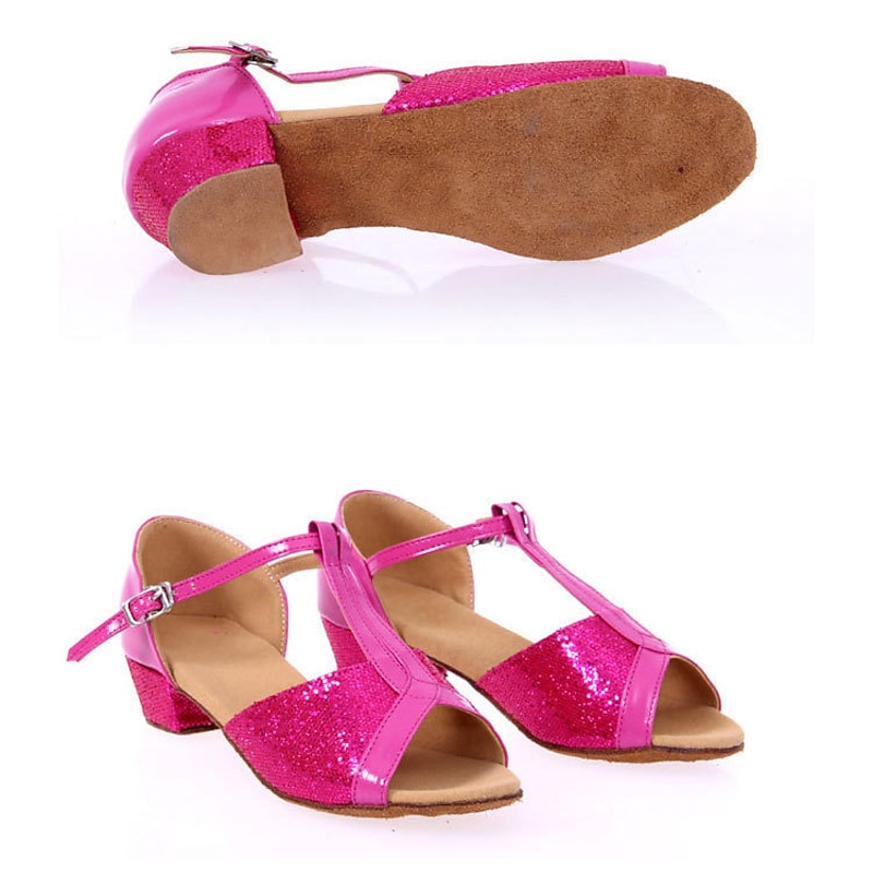 Highlights [Fabric] : Crafted with sparkling glitter upper materials, these dance shoes offer a dazzling look that's sure to catch the spotlight. The high-quality synthetic fabric ensures durability while maintaining a lightweight feel, perfect for young dancers. [Style] : Featuring a flattering low block heel, these shoes provide both stability and comfort, making them ideal for long hours of dancing. The thick heel design supports little feet, ensuring ease of movement without sacrificing style. [Design Highlights] : The T-strap style with an adjustable buckle closure not only enhances the shoe's elegance but also ensures a secure and adjustable fit. The interior is lined with a soft, cushioned material, providing comfort and preventing chafing, so dancers can focus on their performance. [Occasions] : Perfect for stage performances, indoor practice, and special events like Cha-Cha dances. These shoes are designed to shine in any performance setting, making them a must-have for young dancers looking to impress. [Size Notice] : Available in a wide range of sizes from 25 to 41, accommodating various foot sizes and ensuring the perfect fit for every young dancer. Whether in silver or gold, these shoes bring a touch of glamour to every performance.