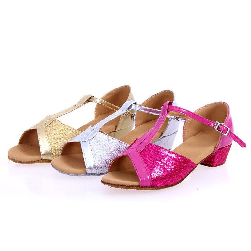 Girls' Latin Dance Shoes Dance Shoes Performance Stage Indoor Sparkling Shoes Heel Glitter Low Heel Thick Heel T-Strap Silver Gold 16