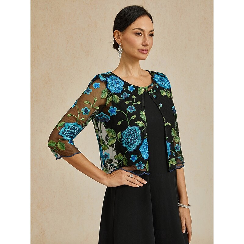 Women's Cardigan Lace Embroidered Elegant Basic Casual Floral Formal Short Crewneck Loose Fit 3/4 Length Sleeve Outerwear Navy Blue Summer Spring 12