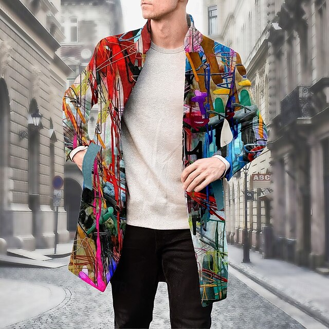 More information about Men's Oil Painting Winter Coat Fleece Jacket Overcoat Thermal Comfortable Artistic Casual Party Daily Wear 3D Print Buttons Front Pocket Winter Turndown Long Sleeve Yellow Blue Purple