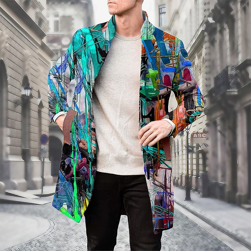Men's Oil Painting Winter Coat Fleece Jacket Overcoat Thermal Comfortable Artistic Casual Party Daily Wear 3D Print Buttons Front Pocket Winter Turndown Long Sleeve Yellow Blue Purple 10