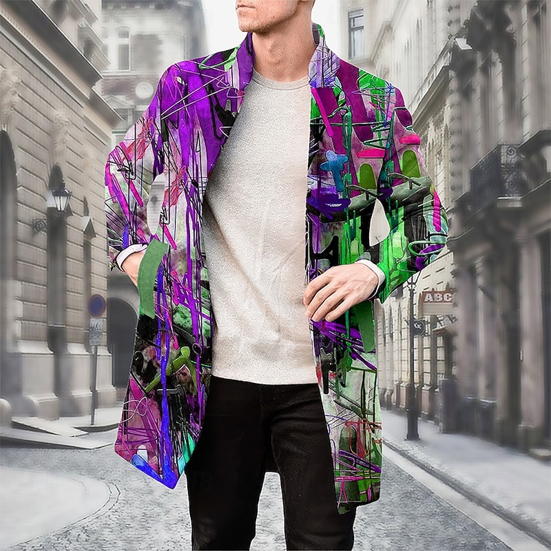 Men's Oil Painting Winter Coat Fleece Jacket Overcoat Thermal Comfortable Artistic Casual Party Daily Wear 3D Print Buttons Front Pocket Winter Turndown Long Sleeve Yellow Blue Purple 7