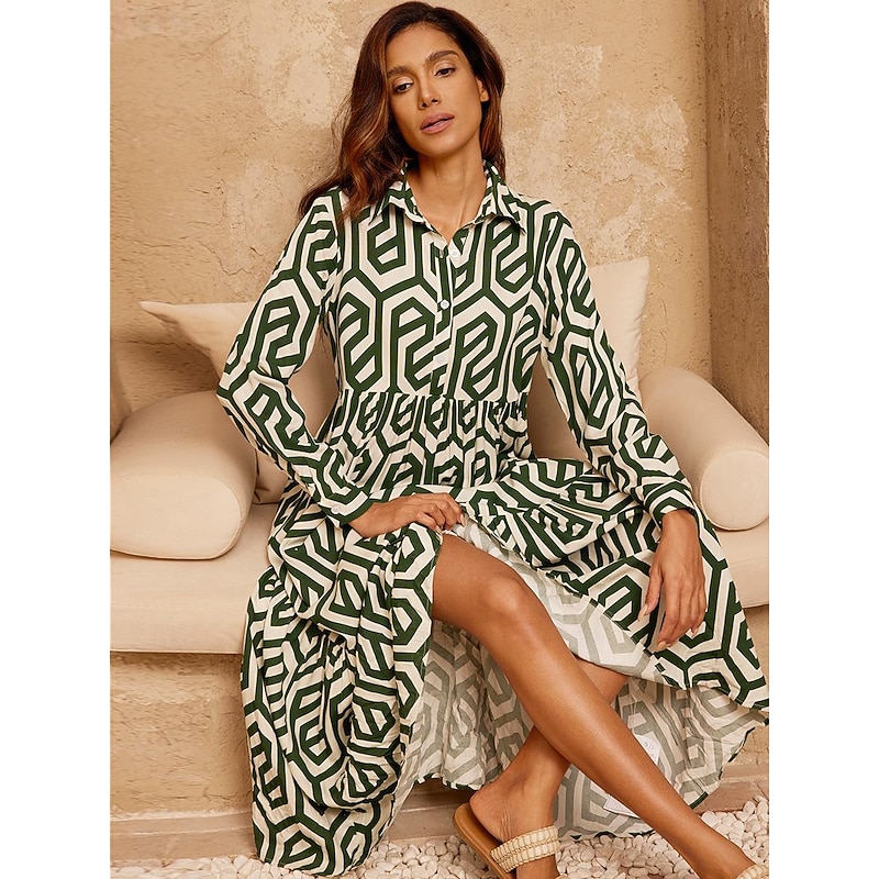 Highlights - Stay stylish and comfortable with this long-sleeve maxi dress for women. - Perfect for any vacation occasion, this dress features a trendy shirt collar neckline. - The drop shoulder sleeves add a touch of modern elegance to this maxi dress.