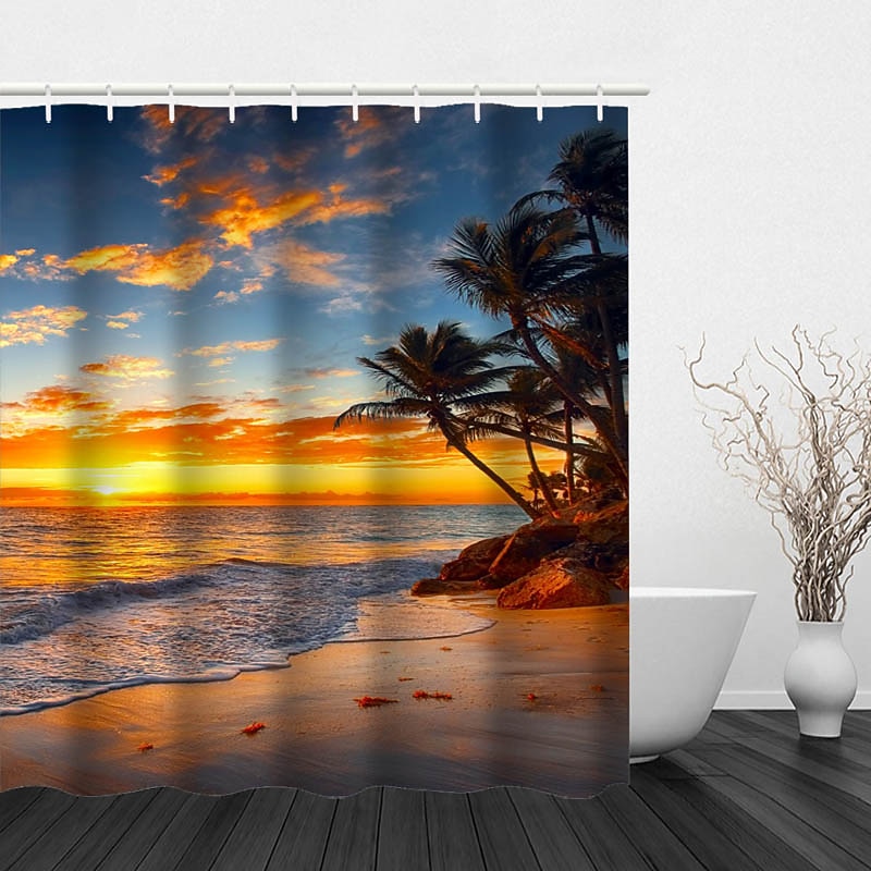 Shower Curtain with Hooks 180cm*180cm(70"*70") Polyester Washable Waterproof Sunrise Sunset Sea Seaside Coconut Tree Pattern 9