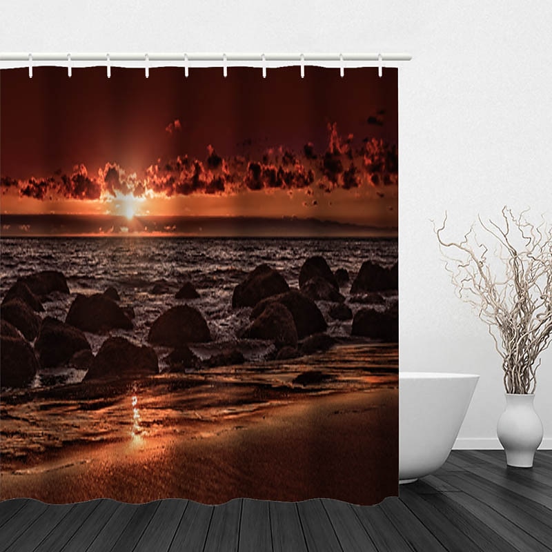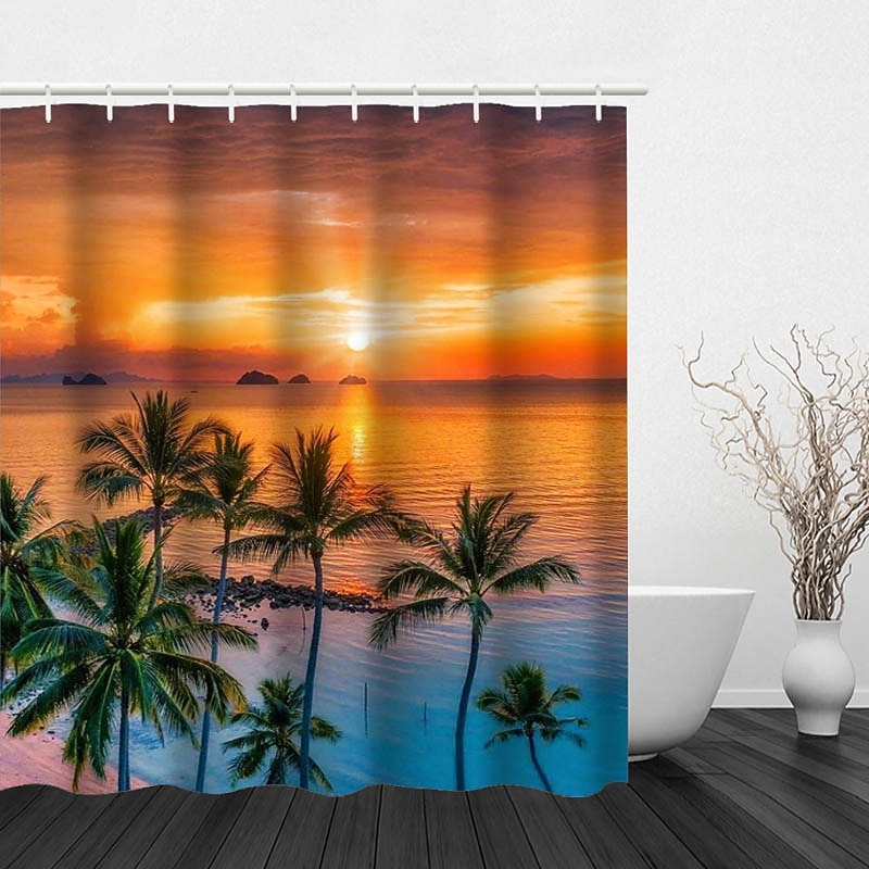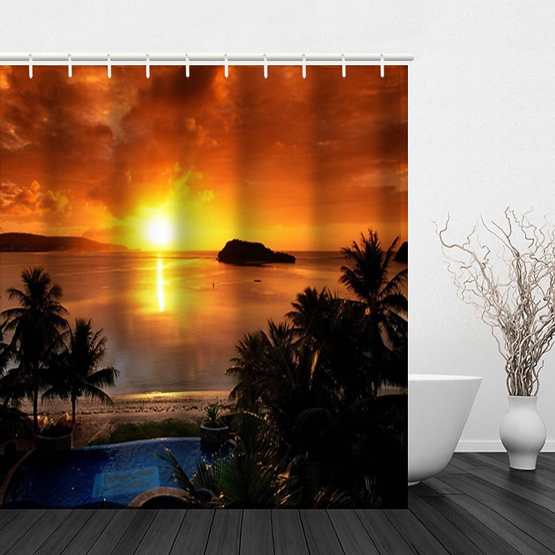 Shower Curtain with Hooks 180cm*180cm(70"*70") Polyester Washable Waterproof Sunrise Sunset Sea Seaside Coconut Tree Pattern 14
