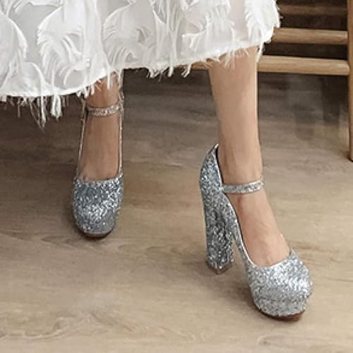 Women's Round Toe High Heels Mary Jane Thick Soled Paired with PU Leather and Lace up Bridal Shoes 6