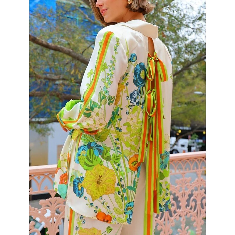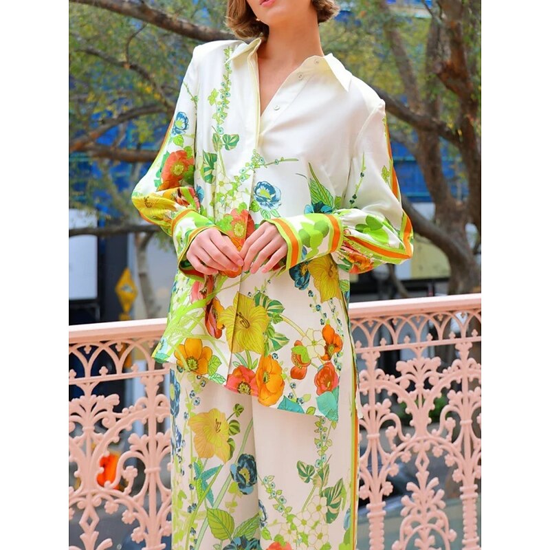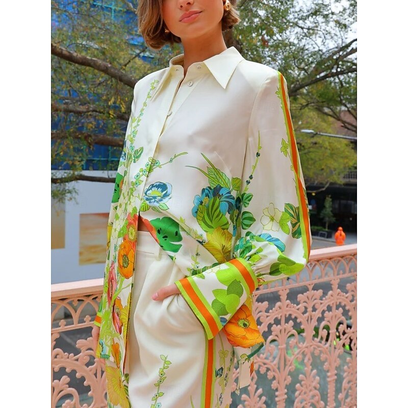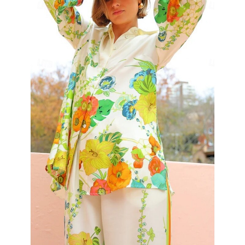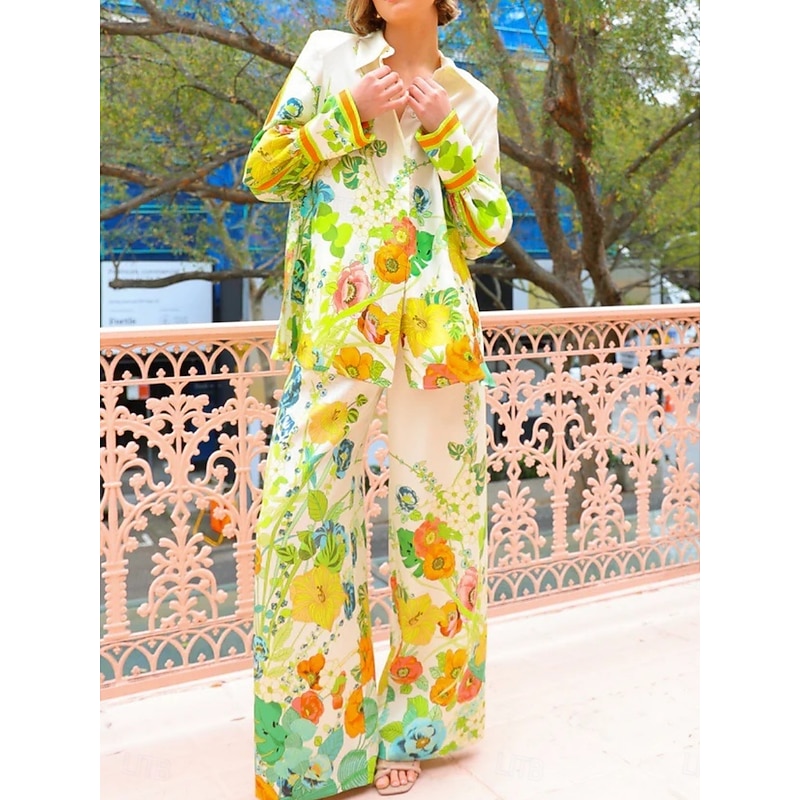 More information about Women's Fashion Streetwear Daily Shirt Blouse Wide Leg Pants Long Sleeve Shirt Collar Plain Print Casual Daily Green Spring & Fall Regular Fit