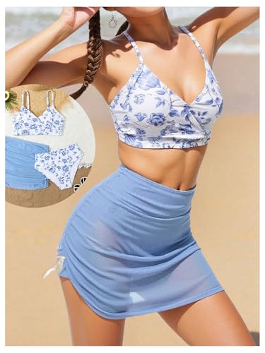 Girl's Swimsuits 3 Piece Floral Spaghetti Strap Wireless Swimwear with Ruched Beach Skirts Bathing Suits 3