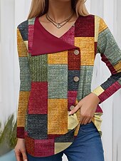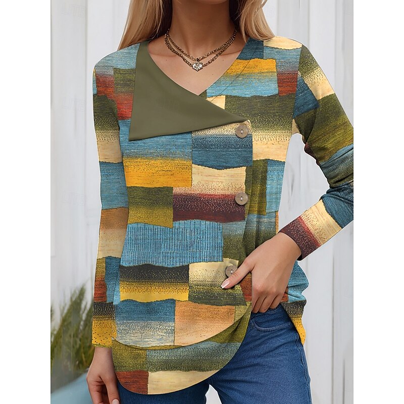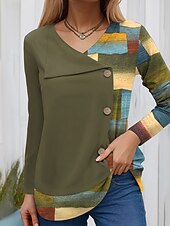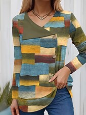 More information about Women's Blouse Tunic V Neck Long Sleeve Buttons Graphic Geometric Vintage Fashion Stylish Regular Tops Daily Patchwork Print Grass Green Yellow Red Green Spring Fall Winter Prefall