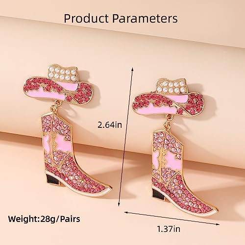 • Size & Details --- Rhinestone Western Cowboy Dangle Size 1.37*2.64 Inches, Weight 28g/Pairs. Long Pink Crystal Cowgirl Boots Hat Statement Earrings for Bachelorette trip in Nashville.