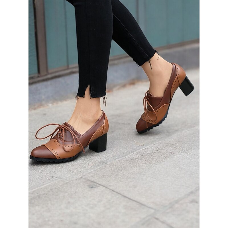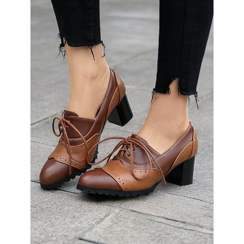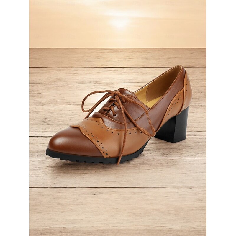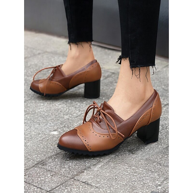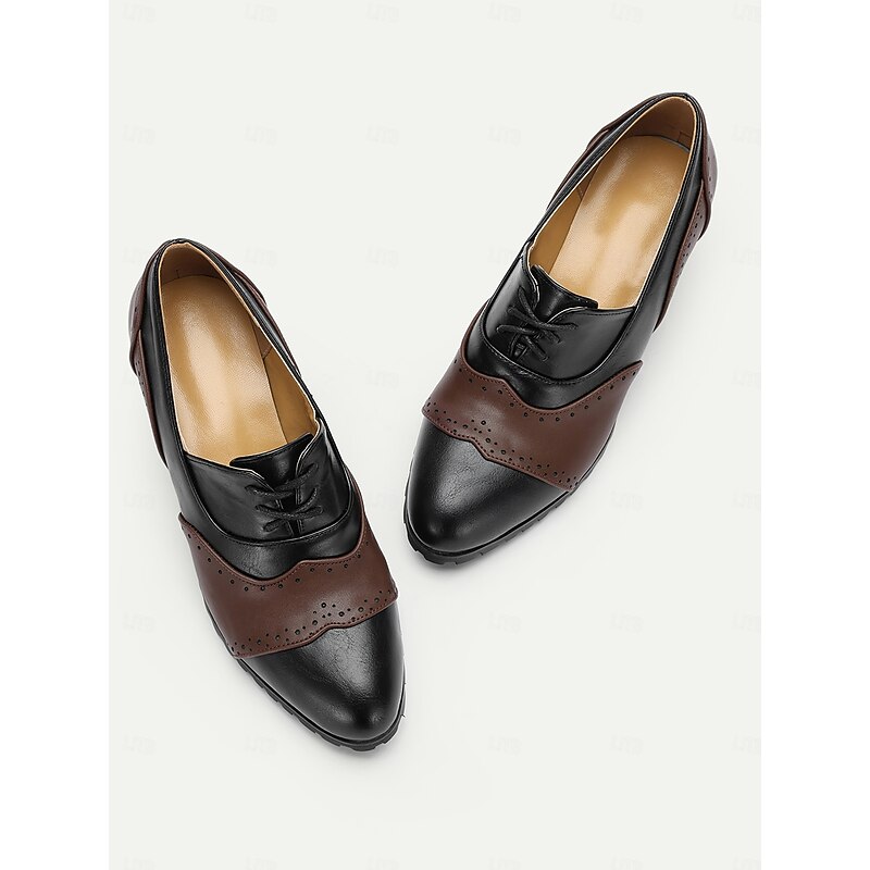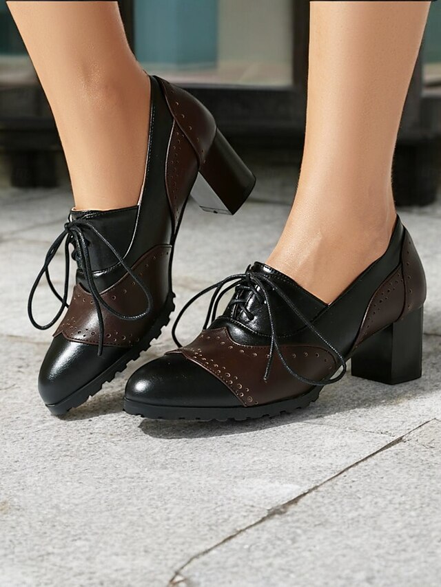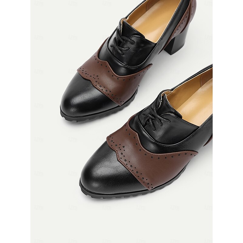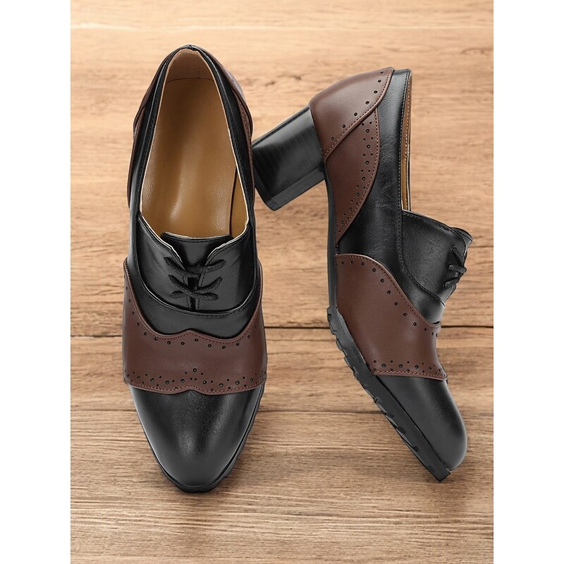 Highlights [Fabric] Crafted from high-quality PU, these vintage-inspired women's oxfords feature a smooth and polished faux leather finish. The synthetic leather lining adds to the comfort and durability, making these shoes an excellent choice for extended wear. [Style] These elegant two-tone brogue oxfords combine the timeless charm of black and dark brown, showcasing intricate brogue detailing on the toe cap and sides. The classic lace-up closure completes the sophisticated look, while the round toe shape offers a comfortable fit. [Design Highlights] The brogue detailing enhances the vintage appeal, and the shoes are designed with a sturdy chunky heel that provides both height and comfort. The durable rubber outsole ensures good traction and stability, suitable for all-day wear. [Occasions] Perfect for work or daily use, these versatile oxfords can be paired with both formal and smart casual outfits. Whether it's a busy day at the office or a casual weekend outing, these shoes are a stylish addition to any wardrobe. [Size Notice] Available in sizes ranging from US5.5/EU35/UK3.5 to US10.5/EU42/UK8.5, it is recommended to select your usual size for the best fit.