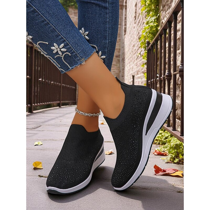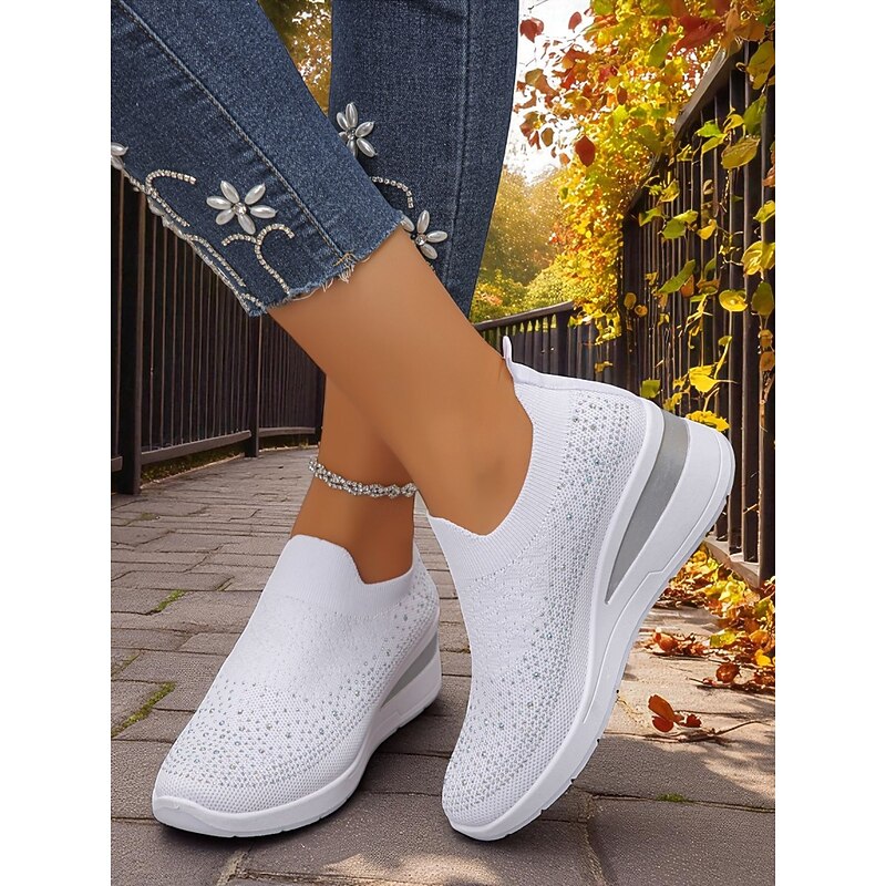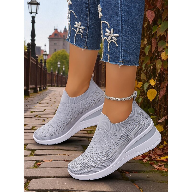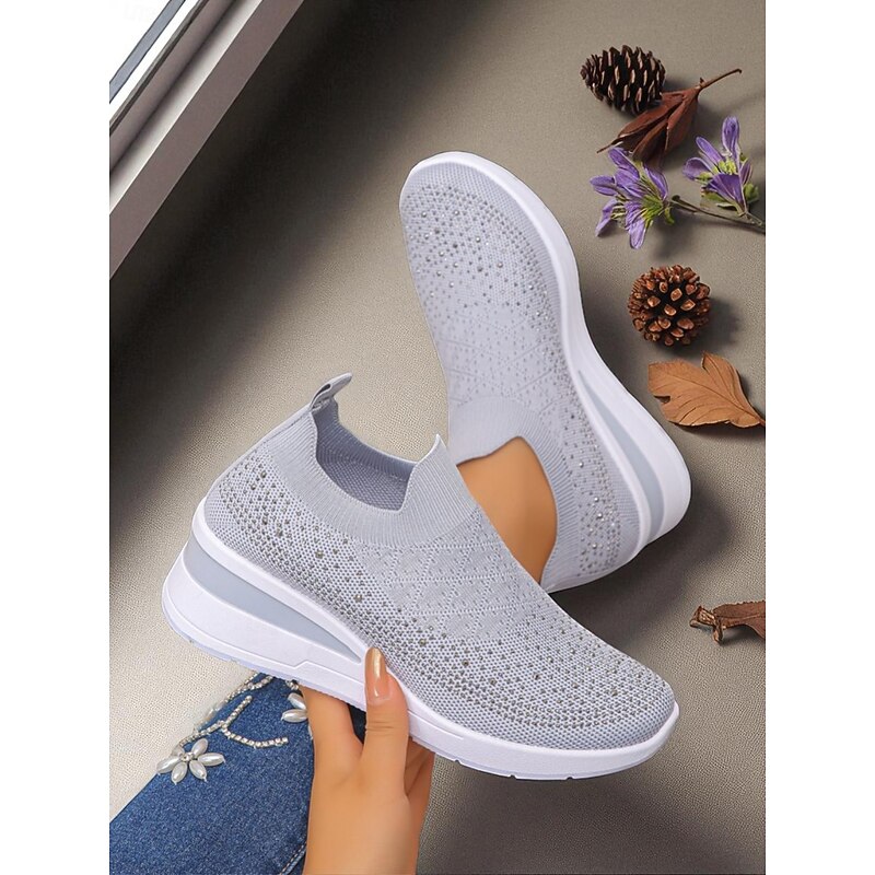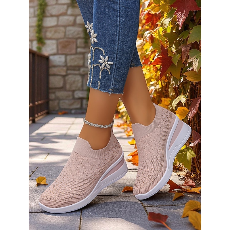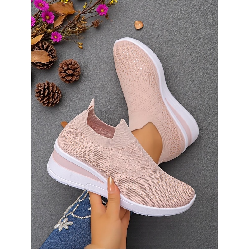 HOT ! Women's Pink Rhinestone Flyknit Slip-On Sneakers – Breathable Lightweight Wedge Shoes for Walking, Fitness and Casual Everyday Wear