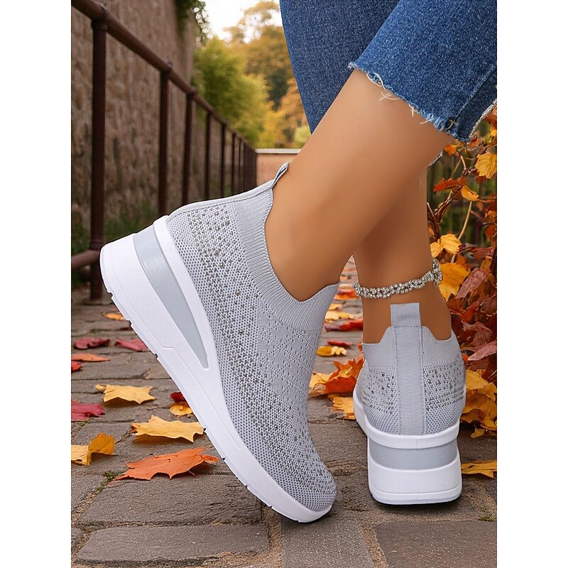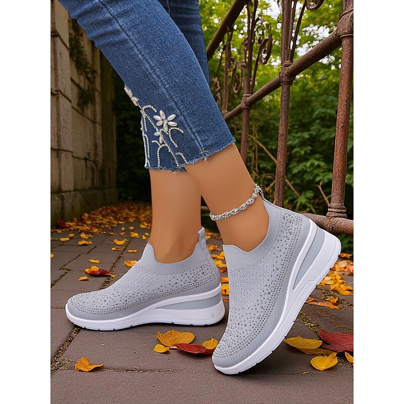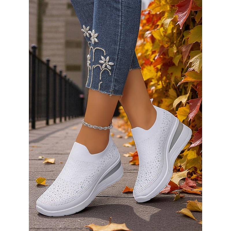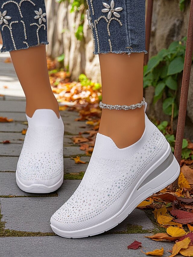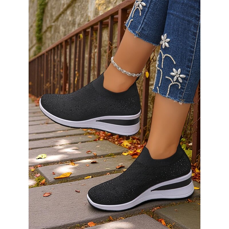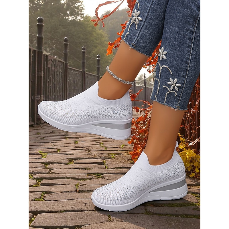HOT ! Women's Pink Rhinestone Flyknit Slip-On Sneakers – Breathable Lightweight Wedge Shoes for Walking, Fitness and Casual Everyday Wear