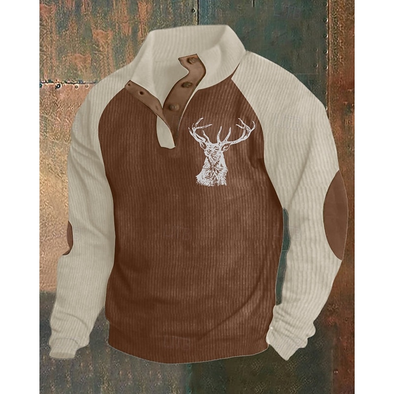 Men's Sweatshirt khaki&black Black Army Green Navy Blue Brown Standing Collar Color Block Reindeer Patchwork Sports & Outdoor Daily Holiday Polyester Corduroy Streetwear Basic Casual Spring & Fall