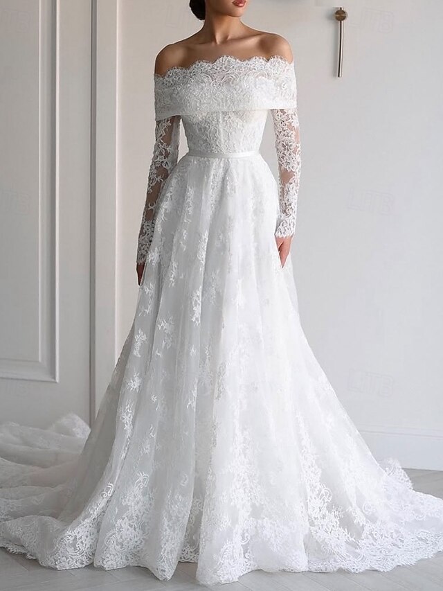 More information about Floral Chantilly Lace Applique Beach Wedding Dress Elegant Off Shoulder Boho Wedding Dresses A-Line Long Sleeve Chapel Train Bridal Gowns Scalloped Hems with Satin Belt 2025