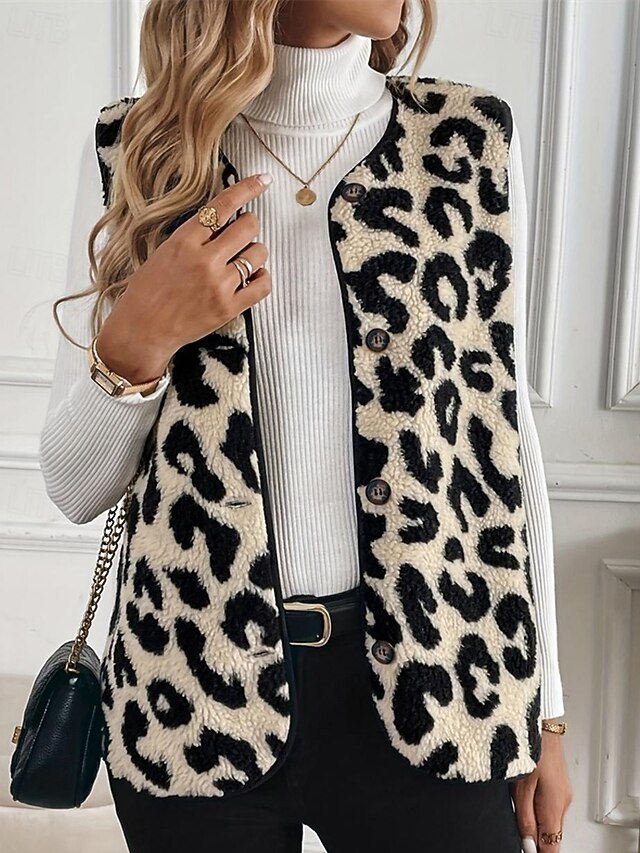 HOT ! Women's Fleece Vest Vest Warm Comfortable Buttons Fleece Lined Fashion Modern Casual Leopard Going out Weekend Single Breasted Regular V Neck Regular Fit Sleeveless Outerwear Apricot Winter